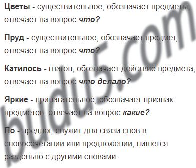 В тексте для изложения ”Жаркий день“ есть слова цветы, пруд, катилось, яркие, по. Что ты можешь рассказать об этих словах?