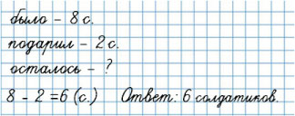 2) У Юры было 8 солдатиков. Он подарил другу 2 солдатика.