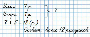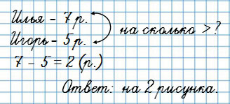 2. На выставку детских рисунков взяли 7 рисунков Ильи и 5 рисунков Игоря. Используя это условие, составь две задачи, одна из которых решается сложением, а другая — вычитанием. Реши эти задачи.