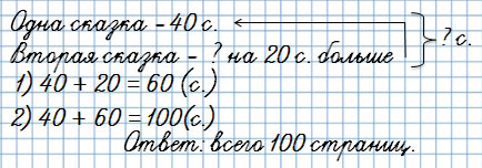 4. Одна сказка занимает 40 страниц, а другая — на 20 страниц больше. Поставь вопрос так, чтобы задача решалась двумя действиями, и реши её.