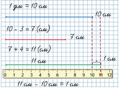 Начерти три отрезка. Первый отрезок длиной 1 дм, второй на 3 см короче первого, а третий на 4 см длиннее второго.