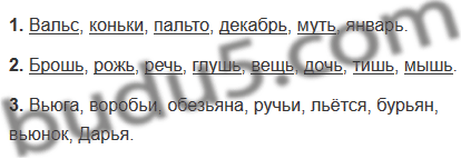 Вьюга, вальс, воробьи, коньки, пальто, обезьяна, брошь, рожь, декабрь, ручьи, речь, льётся, глушь, муть, бурьян, вьюнок, вещь, Дарья, январь, дочь, тишь, мышь.