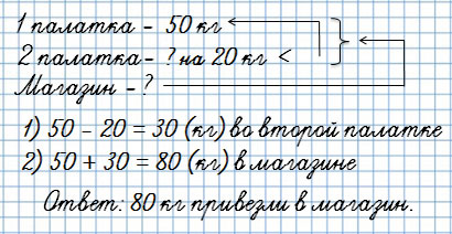 5. В первую овощную палатку привезли 50 кг огурцов, во вторую - на 20 кг меньше, а в магазин — столько, сколько в первую и вторую палатку вместе.