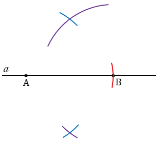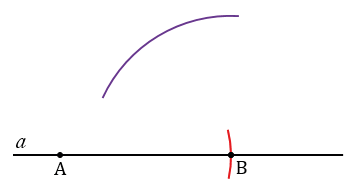 С помощью линейки проводим прямую и на ней с помощью циркуля отложим отрезок АВ, равный отрезку ОЕ. Для этого произвольно на прямой ставим точку А, с помощью циркуля измеряем отрезок ОЕ и строим окружность с центром в точке А радиуса ОЕ (всю окружность строить необязательно, смотри, выделенное синим цветом). Точку пересечения окружности с прямой обозначаем В.