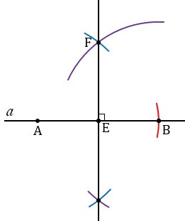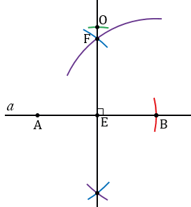 Получим две точки пересечения данных окружностей, через них с помощью линейки проводим прямую, которая пересечет прямую в точке Е и будет перпендикулярна к ней.