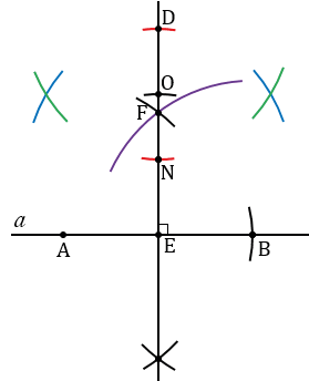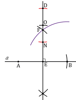 Теперь, через точку О проведем прямую перпендикулярную к прямой ЕО, которая будет параллельна к прямой . На лучах, исходящих из точки О, с помощью циркуля откладываем равные отрезки ЕN и ED. Для этого строим окружность с центром в точке Е, при этом всю окружность строить не обязательно, достаточно сделать пометки по разные стороны от точки Е (смотри выделенное красным).