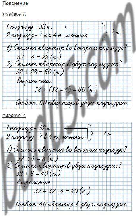 21. В первом подъезде нового дома заселили 32 квартиры, а во втором — на 4 квартиры меньше. Сколько всего квартир заселили в этих двух подъездах?
