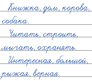 Прочитайте слова, спишите. Обсудите, что называют слова в каждой из строчек: предметы, их признаки или действия. На какие вопросы отвечают?