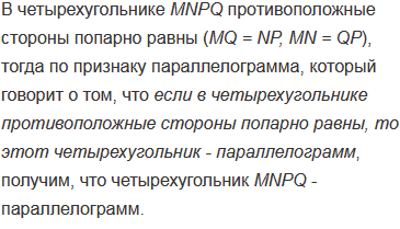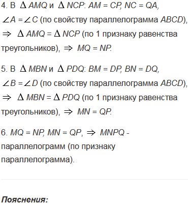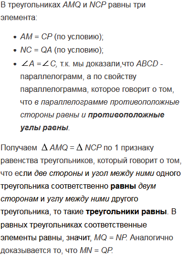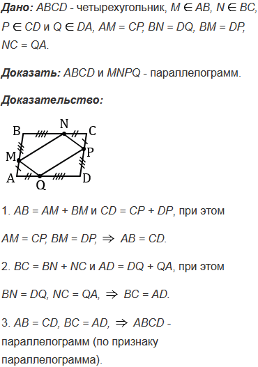 На сторонах АВ, ВС, СD и DА четырехугольника АВСD отмечены соответственно точки М, N, Р и Q так, что АМ = СР, ВN = DQ, ВМ = DP, NC = QA. Докажите, что АВСD и МNPQ - параллелограмм.