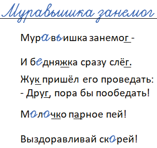 Брат_я, улы_ка, х_дить, скв_рец, м_рко_ь, п_са́ть, з_лёный, сем_я, л_гушка.