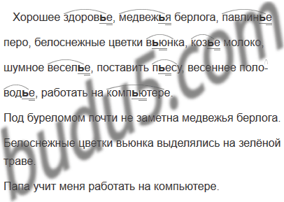 Хорошее здоров..е, медвеж..я берлога, павлин..е перб, белоснежные цветки в..юнка, коз..е молоко, шумное весел..е, поставить п..есу, весеннее половод..е, работать на комп..ютере.