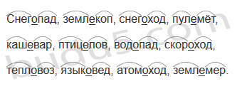 Снегопад, землекоп, снегоход, пулемёт, кашевар, птицелов, водопад, скороход, тепловоз, языковед, атомоход, землемер.