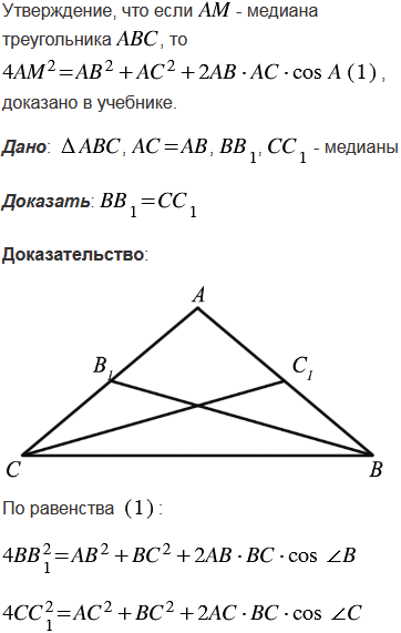 cos А. Пользуясь этой формулой, докажите, что медианы равнобедренного треугольника, проведённые к боковым сторонам, равны.
