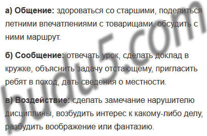 Отвечать урок, здороваться со старшими, сделать замечание нарушителю дисциплины, поделиться летними впечатлениями с товарищами, сделать доклад в кружке, объяснить задачу отстающему, пригласить ребят в поход, обсудить с ними маршрут, дать сведения о местности, возбудить интерес к какому-либо делу, разбудить воображение или фантазию.
