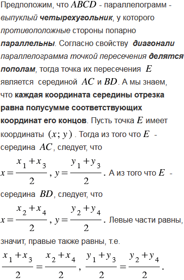 Вершины четырёхугольника ABCD имеют координаты A(x1; y1), B(x2; y2), C(x3; y3) и D(x4; y4). Докажите, что этот четырёхугольник является параллелограммом тогда и только тогда, когда x1 + x3 = x2 + x4 и y1 + y3 = y2 + y4.