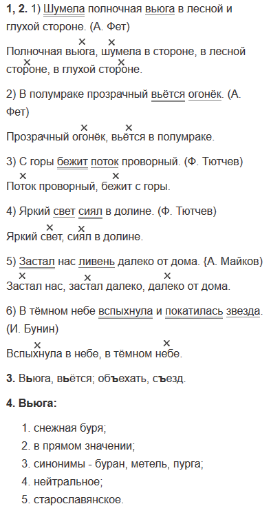 1) Шумела полно́чная вьюга в лесной и глухой стороне. (А. Фет) 2) В полумраке прозрачный вьётся огонёк. (А. Фет) 3) С горы бежит поток проворный. (Ф. Тютчев) 4) Яркий свет сиял в долине. (Ф. Тютчев) 5) Застал нас ливень далеко от дома. (А. Майков) 6) В тёмном небе вспыхнула и покатилась звезда. (И. Бунин)