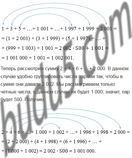 2) Какая из сумм 1 + 3 + 5 + ... + 2 001 и 2 + 4 + 6 + ... + 2 000 больше и на сколько?
