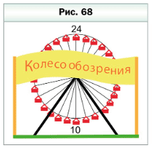 Кабинки развлекательного аттракциона "Колесо обозрения" (рис. 68) последовательно пронумерованы числами 1, 2, 3 и т.д. Сколько всего кабинок, если известно, что когда кабинка с номером 24 занимает самую высокую позицию, то кабина с номером 10 - самую низкую?