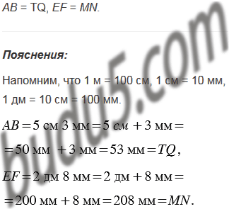 Укажите среди данных отрезков равные, если: АВ = 5 см 3 мм, CD = 4 м 5 см, PK = 45 см, EF = 2 дм 8 мм, TQ = 53 мм, MN = 208 мм.