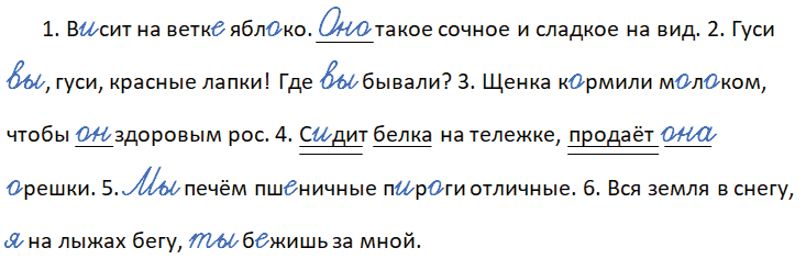 1. В_сит на ветк_ ябл_ко. ___ такое сочное и сладкое на вид. 2. Гуси ___, гуси, красные лапки! Где ___ бывали? 3. Щенка к_рмили м_л_ком, чтобы ___ здоровым рос. 4. С_дит белка на тележке, продаёт ___ _решки. 5. ___ печём пш_ничные п_р_ги отличные. 6. Вся земля в снегу, ___ на лыжах бегу, ___ б_жишь за мной.