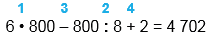 1) 6 • 800 = 4 800 2) 800 : 8 = 100 3) 4 800 - 100 = 4 700 4) 4700 + 2 = 4 702 | ||||||||||||||||||||||||||||||||||||||||||||||||||||||||||||||||||||||||||||||||||||||||||||||||||||||||||||||||||
