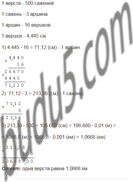 При Петре I в России с развитием торговли и промышленности назрела необходимость приведения в определенную систему различных мер. Были утверждены такие единицы длины: верста, сажень, аршин, вершок. Верста была равна 500 саженям, сажень - 3 аршина, аршин - 16 вершкам. Скольким километрам равна верста, если вершок равен 4,445 см?