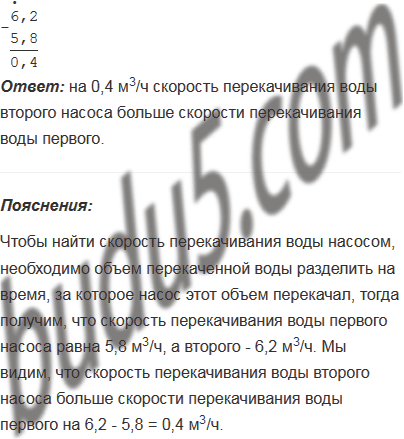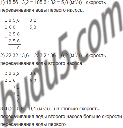 Первый насос перекачивает 18,56 м3 воды за 3,2 ч, а второй - 22,32 м3 воды за 3,6 ч. У какого из насосов скорость перекачивания воды больше и на сколько кубических метров?