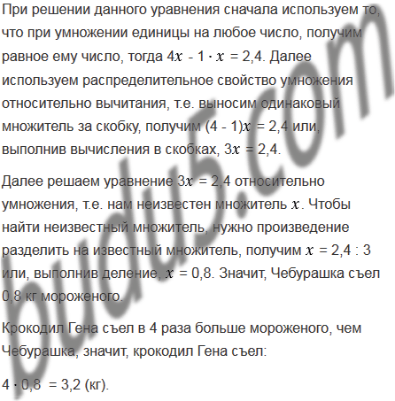 Крокодил Гена съел в 4 раза больше мороженого, чем Чебурашка. Сколько мороженого съел каждый из них, если Чебурашка съел на 2,4 кг меньше, чем крокодил Гена?