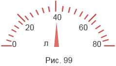 На рисунке 99 изображена шкала прибора, показывающего, сколько литров бензина осталось в баке автомобиля. Сколько литров бензина сейчас в баке? На сколько делений и в какую сторону передвинется стрелка прибора, если: