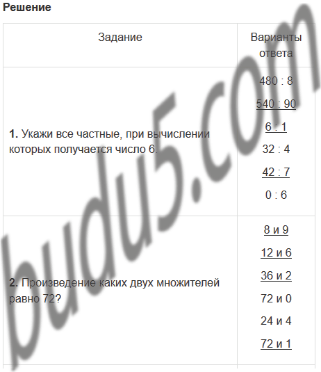 | 2. Произведение каких двух множителей равно 72? | 8 и 9 12 и 6 36 и 2 72 и 0 24 и 4 72 и 1 |