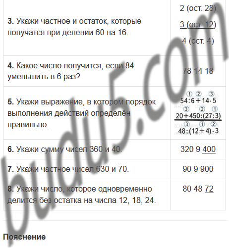 | 3. Укажи частное и остаток, которые получатся при делении 60 на 16. | 2 (ост. 28) 3 (ост. 12) 4 (ост. 4) |