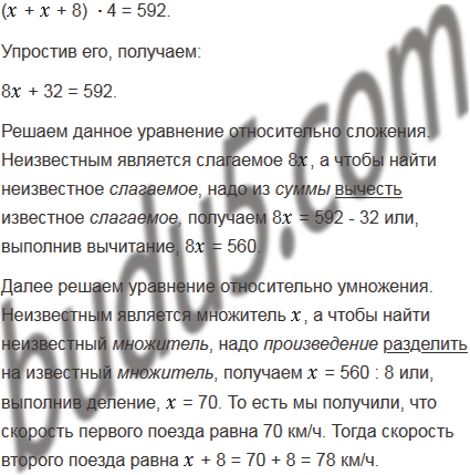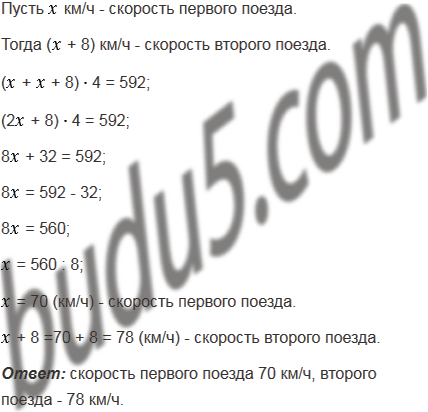 Два поезда вышли навстречу друг другу одновременно из двух городов, расстояние между которыми 592 км. Через 4 ч они встретились. Какова скорость каждого поезда, если известно, что скорость одного из них на 8 км/ч больше скорости другого?
