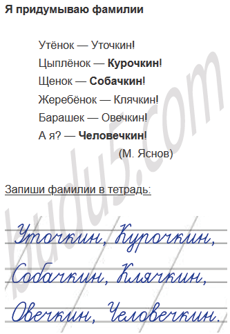 Прочитай. Догадайся, какие фамилии нужно вставить в текст стихотворения. Спиши фамилии в тетрадь. Не забывай, что фамилии пишутся с прописной буквы.