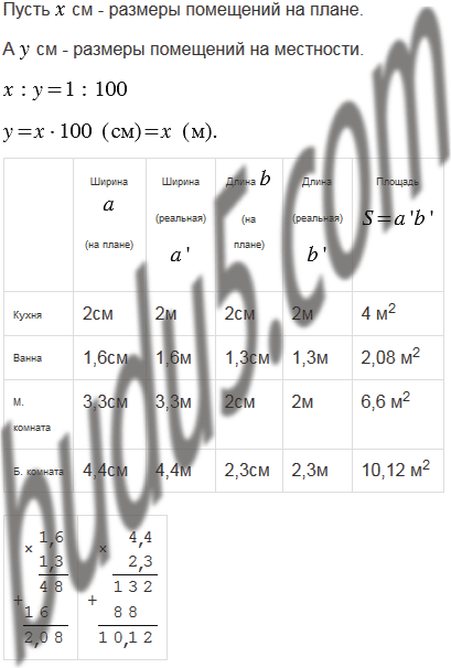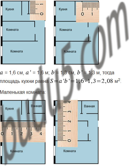 На рисунке 37 дан план квартиры в масштабе 1 : 100. Определите по плану, какие размеры имеют кухня, ванная и комнаты и какова их площадь в действительности.