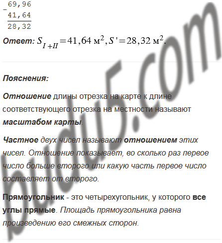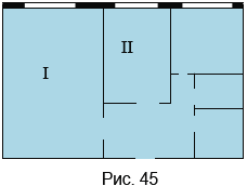 На рисунке 45 изображён план двухкомнатной квартиры в масштабе 1 : 200. Определите по плану сумму площадей двух жилых комнат (I и II) и площадь, которую занимают остальные помещения этой квартиры.