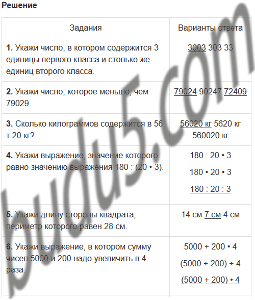 | 6. Укажи выражение, в котором сумму чисел 5000 и 200 надо увеличить в 4 раза. | 5000 + 200 • 4 (5000 + 200) + 4 (5000 + 200) • 4 |