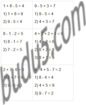 | 1 + 8 - 5 = 8 - 1 - 2 = 2 + 7 - 6 = | 9 - 5 + 3 = 4 + 2 + 2 + 1 = 8 - 4 + 5 - 7 = |