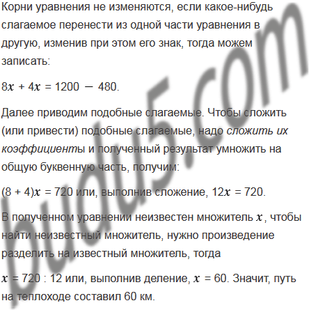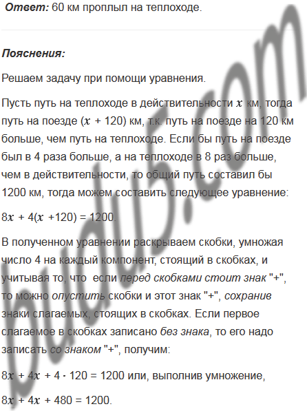 В летние каникулы я проехал на поезде на 120 км больше, чем проплыл на теплоходе. Если бы я проехал на поезде в 4 раза больше, а на теплоходе проплыл в 8 раз больше, чем в действительности, то общий путь составил бы 1200 км. Сколько километров я проплыл на теплоходе?
