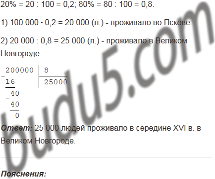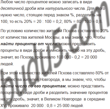 В середине XVI в. в Москве проживало 100 000 жителей и она была самым многочисленным городом Московского государства. После столицы по числу жителей выделялись города Великий Новгород и Псков. Количество жителей Пскова составляло 20% от количества жителей Москвы и 80% от количества жителей Новгорода. Сколько людей проживало в середине XVI в. в Великом Новгороде?