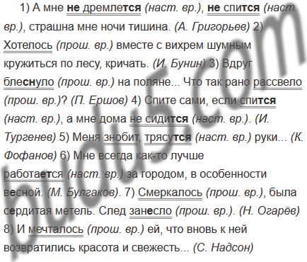 1) А мне (не)дремлет(?)ся, (не)спит(?)ся, страшна мне ночи тишина. (А. Григорьев) 2) Хотелось вместе с вихрем шумным кружиться по лесу, кричать. (И. Бунин) 3) Вдруг блес(?)нуло на поляне... Что так рано рассвело? (П. Ершов) 4) Спите сами, если спит(?)ся, а мне дома не сидит(?)ся. (И. Тургенев) 5) Меня знобит, трясут(?)ся руки... (К. Фофанов) 6) Мне всегда как-то лучше работа..т(?)ся за городом, в особенности в..сной. (М. Булгаков). 7) Смеркалось, была с..рдитая метель. След зан..сло. (Н. Огарёв) 8) И мечталось ей, что вновь к ней возвратились красота и свежесть... (С. Надсон)