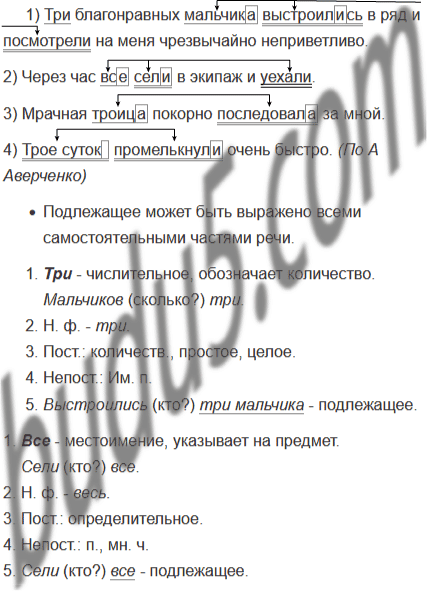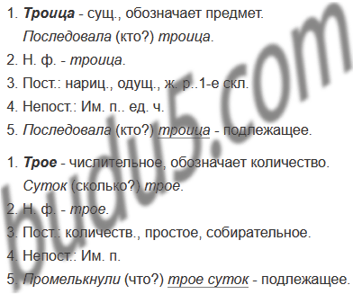 1) Три3 благонравных мальчика выстроились в ряд и посмотрели на меня чрезвычайно неприветливо. 2) Через час все3 сели в экипаж и уехали. 3) Мрачная троица3 покорно последовала за мной. 4) Трое3 суток промелькнули очень быстро. (По А Аверченко)