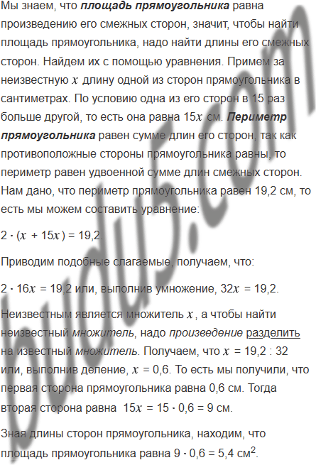 Одна из сторон прямоугольника в 15 раз больше другой, а его периметр равен 19,2 см. Найдите площадь прямоугольника.