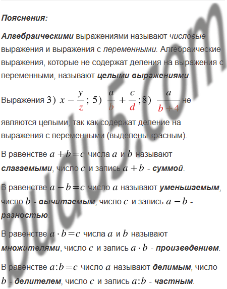 Используя термины "сумма", "разность", "произведение", "частное", прочитайте алгебраические выражения и укажите, какие из них являются целыми: