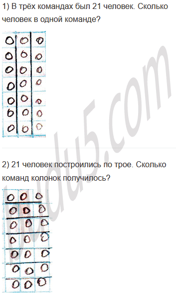 Задание № 7. Придумай две различны по смыслу задачи, которые решаются так: 21 : 3 = 7. Покажи решение каждой задачи на чертеже.