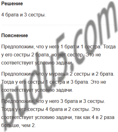Задание № 12. У муравья столько же сестёр, сколько и братьев, а у его сестры в 2 раза меньше сестёр, чем братьев. Сколько братьев и сестёр в этой муравьиной семье?