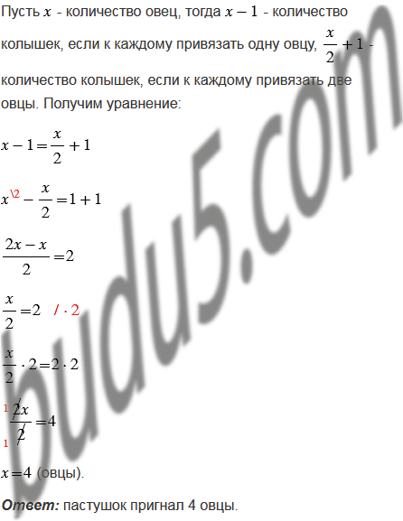(Задача из русского фольклора.) Пастушок пригнал на поляну овец. На поляне были колышки. Если к каждому колышку он привяжет по овце, то для одной колышка не хватит. Если же к каждому колышку он привяжет по две овцы, то один колышек останется свободным. Сколько овец пригнал пастушок?