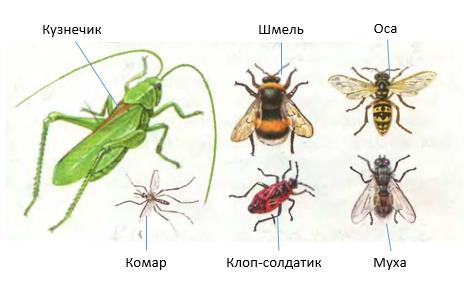 Назовём насекомых: кузнечик, шмель, оса, комар, клоп-солдатик, муха.