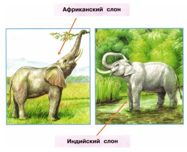 1. Определи, какой из этих слонов африканский, а какой – индийский. Укажи стрелками. Объясни, по какому признаку тебе удалось их различить.