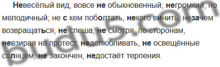(Не)весёлый вид, вовсе (не)обыкновенный; (не)громкий, но мелодичный; не(с)кем поб..лтать, (не)кого в..нить, не(за)чем возвращат(?)ся, (не)спеша, (не)смотря по сторонам, (не)взирая на пртест, (не)долюбливать, (не)освещённые со(?)нцем, (не)закончен, (не)достаёт терпения.