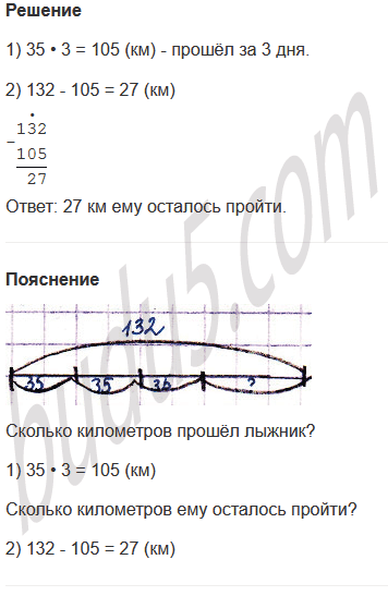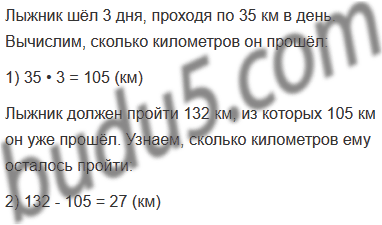 Задание № 8. Лыжник должен пройти 132 км. Он шёл 3 дня, проходя по 35 км в день. Сколько километров ему осталось пройти?